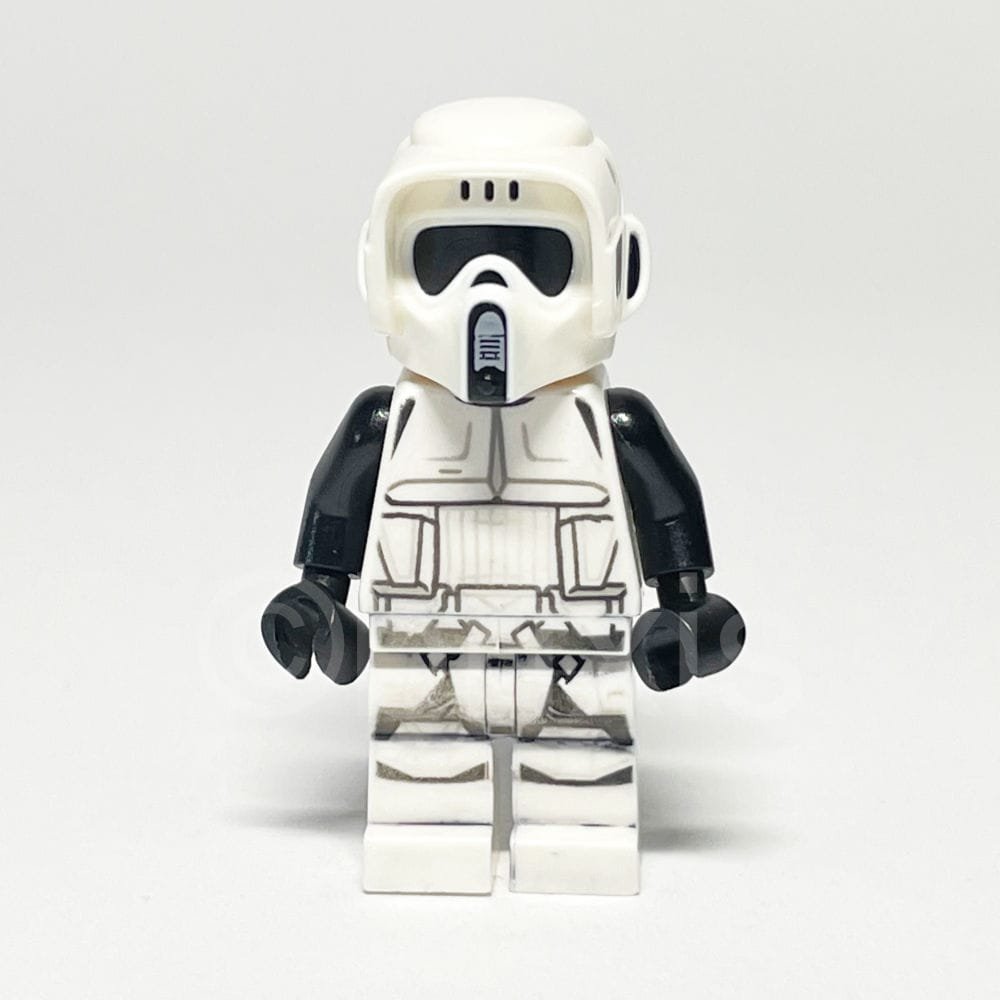 • Torso: Weißer Torso mit detaillierter Rüstung im Stil eines Scout Troopers, ergänzt durch einen schmalen Gürtel, schwarze Arme und schwarze Hände, die ein futuristisches und kampfbereites Aussehen verleihen.