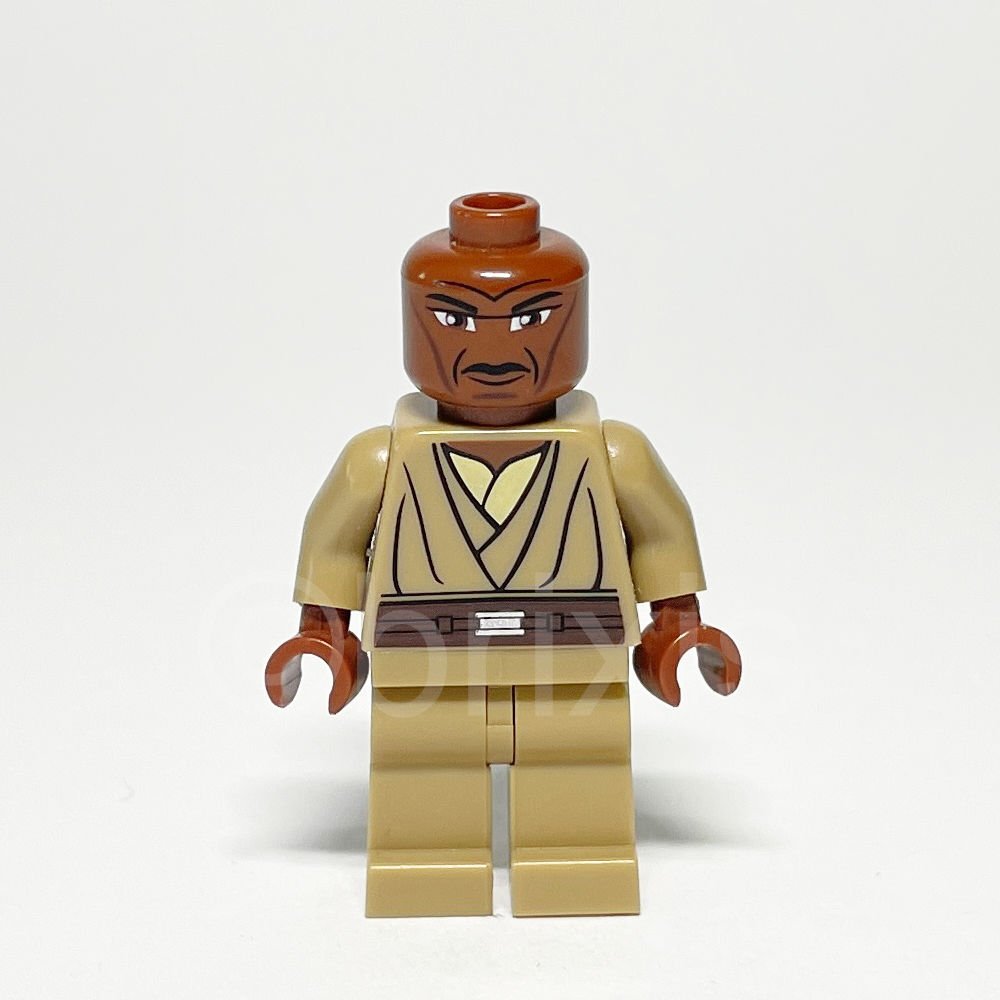 Die Minifigur besticht durch ihren dunkelbeigen Torso, der mit einem detailreichen, geschichteten Hemd und einem braunen Gürtel bedruckt ist. Die dunkelbeigen Arme und rötlich-braunen Hände ergänzen das Erscheinungsbild harmonisch. Besonders auffällig ist der rötlich-braune Kopf, der mit feinen Linien und einem markanten Stirnrunzeln die entschlossene Mimik von Mace Windu einfängt. Die schlichten dunkelbeigen Hüften und Beine runden das minimalistische, aber kraftvolle Design ab.