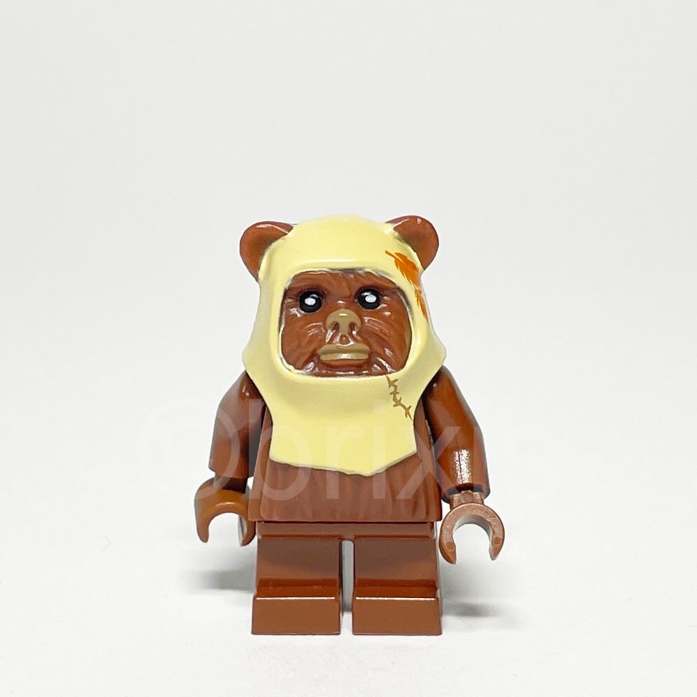 • Kopf: Rötlich-brauner Kopf mit modifizierter Form, die eine Kapuze in Hellbraun und ein Muster aus dunkelorangen Federn zeigt, ideal für eine Ewok-Minifigur.