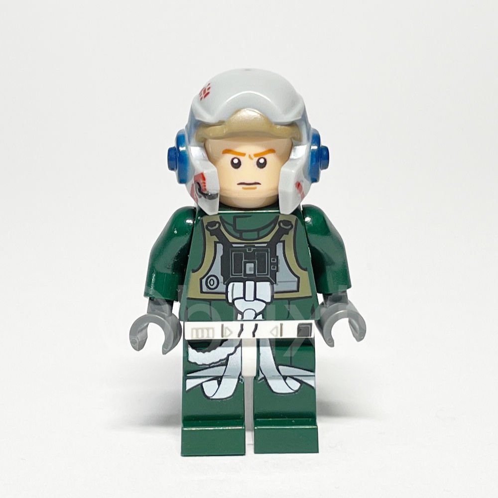 Die Minifigur beeindruckt durch ihren dunkelgrünen Torso, der mit einer dunkelbeigen Weste und einem schwarzen Frontpanel mit Atemgerät verziert ist. Die dunkelgrünen Arme und dunkelgrauen Hände ergänzen das authentische Design. Ihr hellgrauer Helm ist mit einem charakteristischen A-wing-Pilot-Muster in dunkelbeige, sandblau und dunkelblau versehen. Der Kopf der Figur zeigt einen doppelseitigen Gesichtsausdruck in hellem Nougatton, mit einem finsteren und einem erschrockenen Blick. Die dunkelgrünen Beine sind mit einem weißen Flugriemen und einem Schlauchmuster auf dem rechten Bein bedruckt.