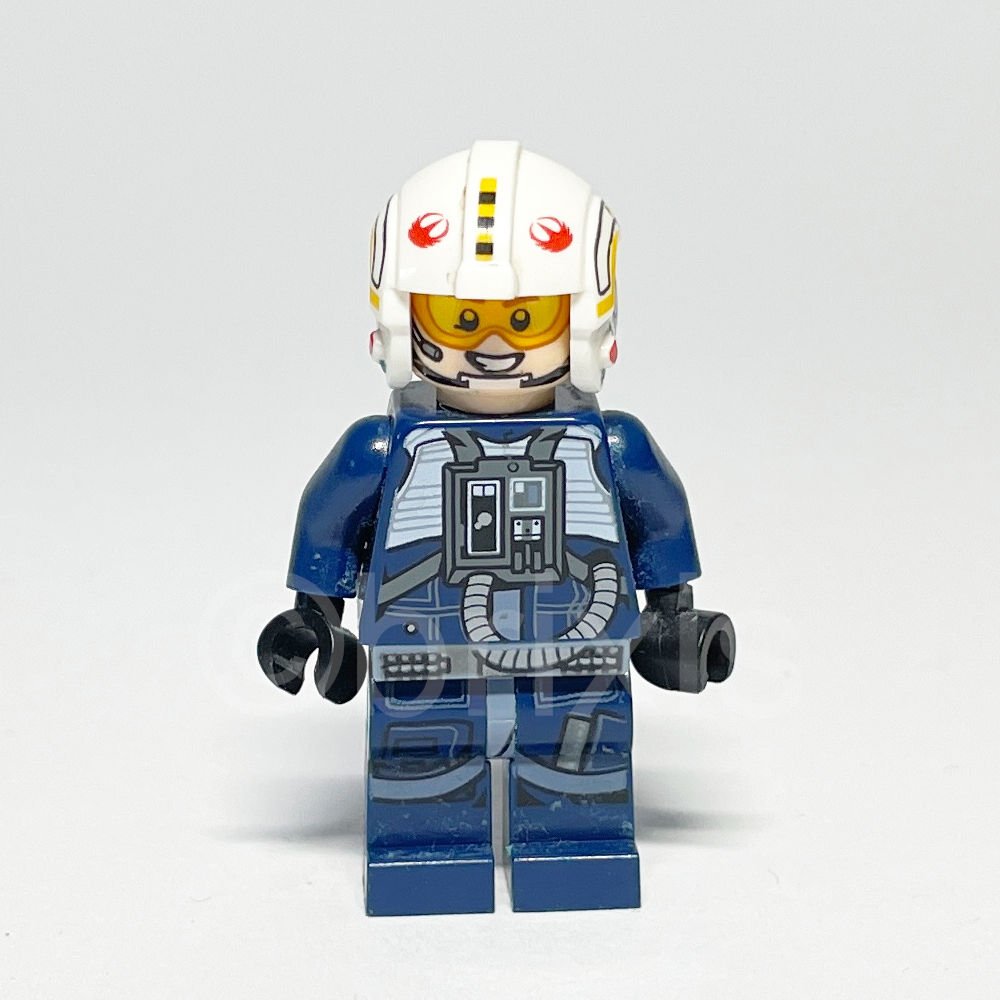 Die Gestaltung der Minifigur beeindruckt durch ihren detailreichen dunkelblauen Torso, der mit einer sandblauen Weste und einem dunkelgrauen Frontpanel mit Schlauchmuster versehen ist. Die Arme sind ebenfalls dunkelblau, während die Hände in Schwarz gehalten sind. Der Kopf der Figur zeigt einen doppelseitigen Gesichtsausdruck in hellem Nougatton, komplettiert durch ein orangefarbenes Visier und braune Augenbrauen. Besonders markant ist der weiße Helm mit rotem Rebellenlogo und schwarzen sowie gelben Streifen, der perfekt zu einem Y-wing Piloten passt.