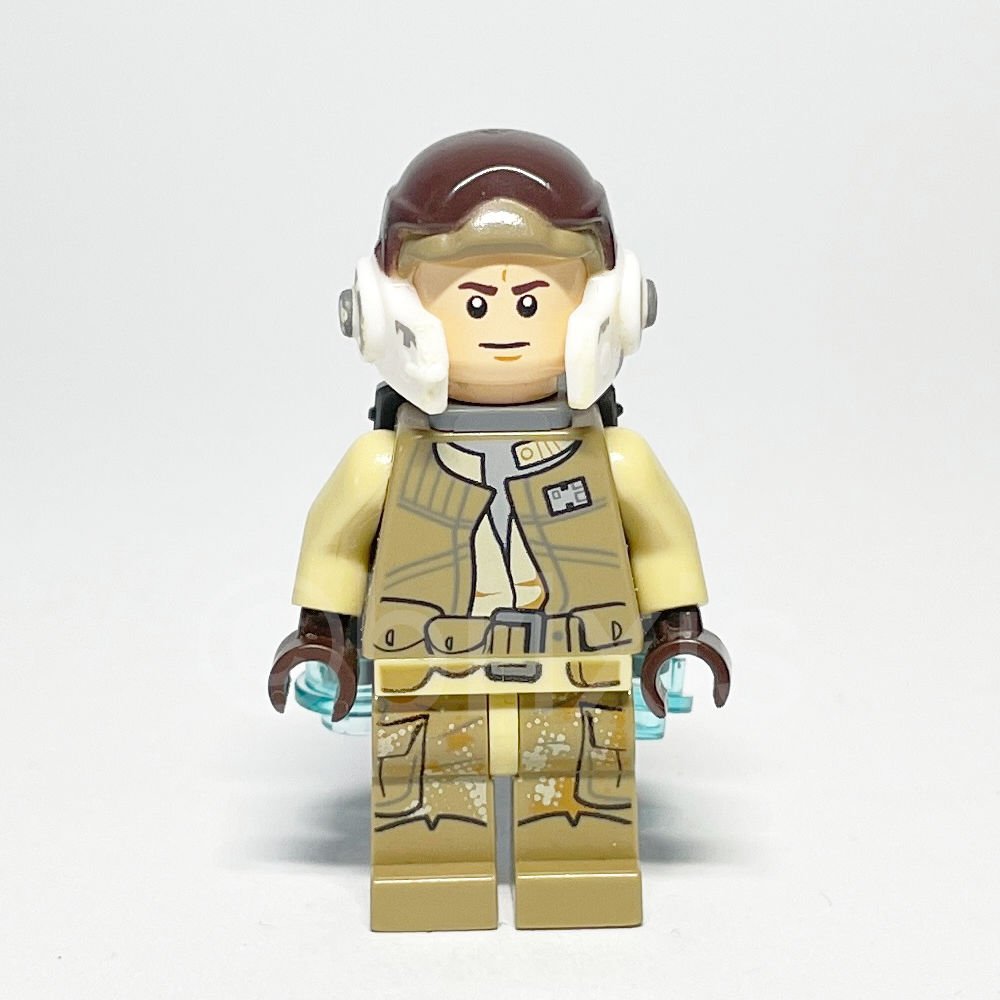 - Torso: Dunkelbrauner Torso mit einer Star Wars-Rebellenweste über einem hellbraunen Hemd und einem Gürtel mit Taschenmuster, ergänzt durch hellbraune Arme und dunkelbraune Hände.