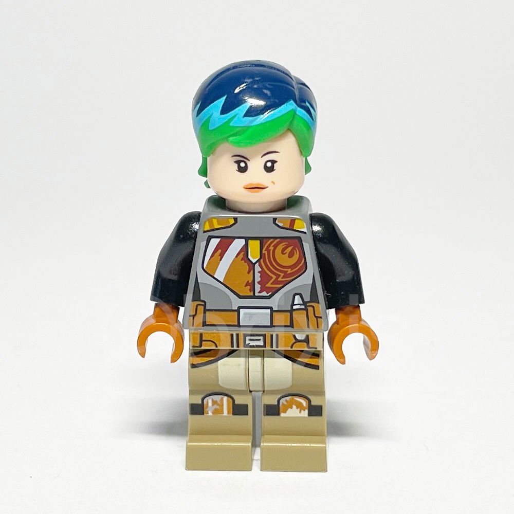 Die Gestaltung der Minifigur ist bemerkenswert detailreich. Sabine trägt einen dunkelgrauen Torso, der mit Mandalorianer-Rüstungsplatten in Dunkelrot, Dunkelorange und Gelb verziert ist. Diese sind mit dem Rebel Starbird und einem praktischen Gürtelmuster versehen. Schwarze Arme und dunkelorangene Hände runden das Bild ab. Ihr Haarteil in leuchtendem Grün, ergänzt durch ein hell- und dunkelblaues Muster, verleiht ihr einen unverwechselbaren Look. Der doppelseitige Gesichtsausdruck auf dem Kopf in hellem Nougatton bietet sowohl einen neutralen als auch einen entschlossenen Ausdruck, was ihre Vielseitigkeit unterstreicht.