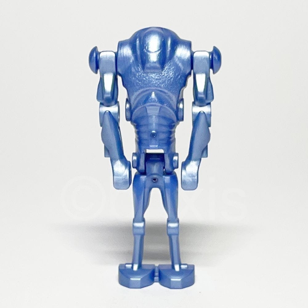 Der Super Battle Droid zeichnet sich durch sein markantes Design in Perlen-Sandblau aus. Besonders hervorzuheben ist der mechanische Arm mit solidem Ellbogengelenk, der die Stärke und Funktionalität eines Superkampfdroiden symbolisiert. Der breite Torso mit integriertem Kopf unterstreicht die robuste Bauweise, während die mechanischen Beine mit durchgehendem Element zwischen den Füßen die Stabilität der Figur betonen.