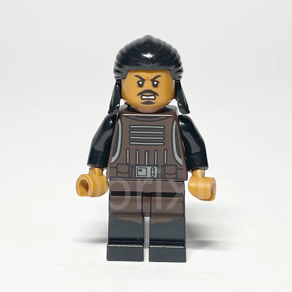 - Torso: Dunkelbrauner Torso mit einer Star Wars-Weste, die Körperpanzerung mit vier Riemen, Schnallen und einem Werkzeuggürtelmuster zeigt, ergänzt durch schwarze Arme und mittel-nougatfarbene Hände
