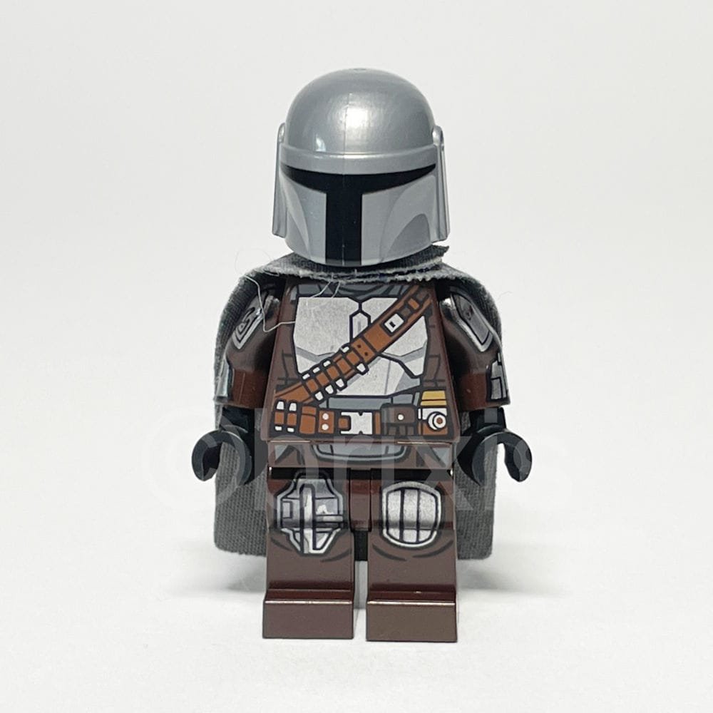 - Torso: Dunkelbrauner Torso mit silbernem Beskar-Rüstungsmuster und rötlich-braunen Gürteln, kombiniert mit dunkelbraunen Armen und schwarzen Händen, die das Erscheinungsbild von Din Djarin perfekt abrunden