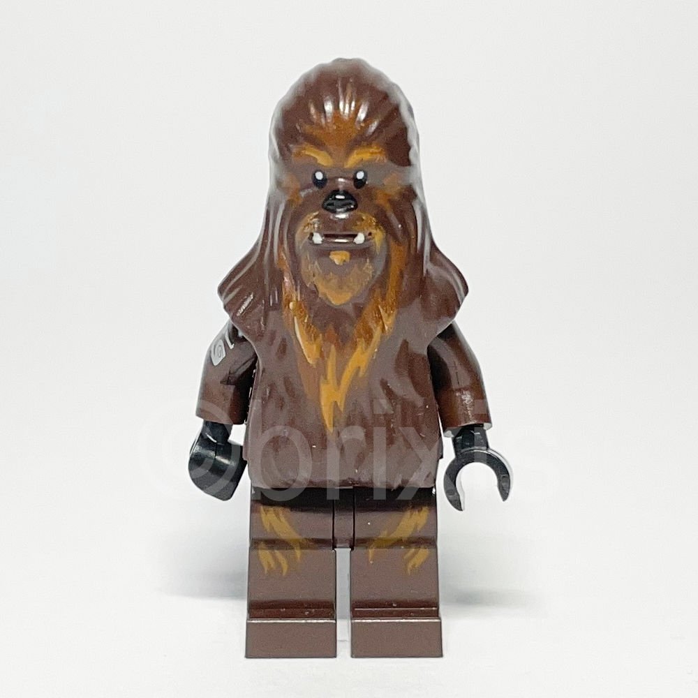 - Kopf: Dunkelbrauner Kopf mit modifiziertem Design, inspiriert von einem Wookiee namens Wullffwarro, versehen mit einem Muster aus dunkelorangenem Fell.