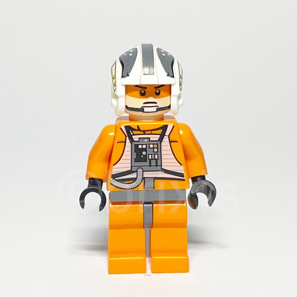 Die Minifigur beeindruckt durch ihren detailreichen, orangen Torso, der das ikonische Outfit eines Rebellenpiloten zeigt. Besonders auffällig ist der präzise Aufdruck auf der Rückseite des Torsos, der die Uniform authentisch wiedergibt. Die Kombination aus orangefarbenen Armen und schwarzen Händen ergänzt das Design perfekt. Der Kopf der Figur ist in einem hellen Nougatton gehalten und zeigt einen ernsten Gesichtsausdruck, der durch ein orangefarbenes Visier und ein Kinnriemenmuster akzentuiert wird. Der weiße Helm mit einem dunkelblaugrauen, geschwungenen Muster verleiht der Figur eine markante Note.