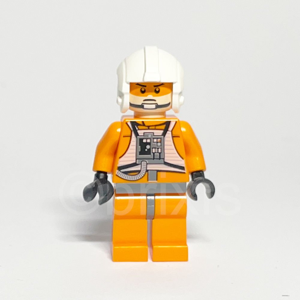 Die Minifigur besticht durch ihren charakteristischen orangen Torso, der die Uniform eines Rebellenpiloten detailgetreu wiedergibt. Besonders auffällig sind die bedruckten Rückenpartien und das orangefarbene Visier, das den ernsten Gesichtsausdruck des Piloten unterstreicht. Der weiße Helm, schlicht gehalten, verleiht der Figur einen authentischen Look, der den Stil der Rebellenpiloten perfekt einfängt. Die Kombination aus dunkelbläulich-grauen Hüften und schlichten, orangefarbenen Beinen rundet das Erscheinungsbild ab.
