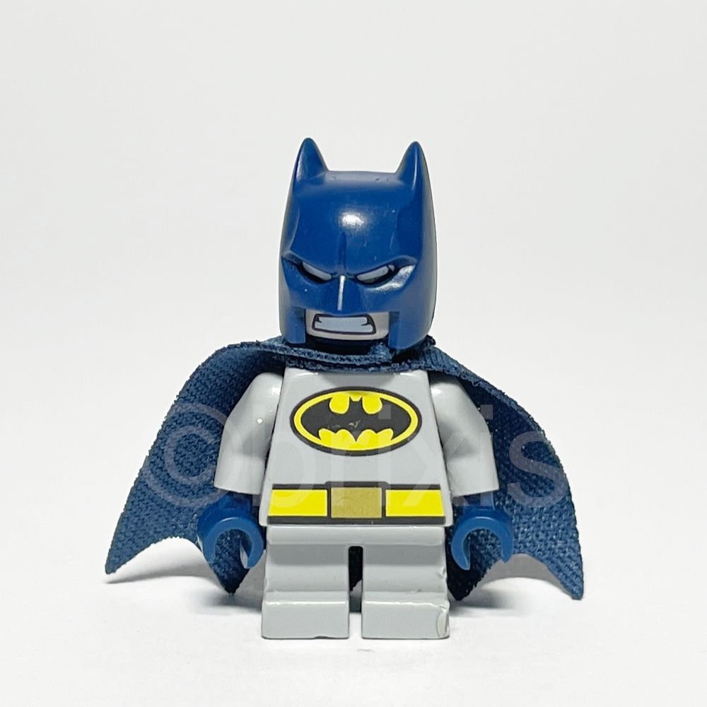 Die Gestaltung der Minifigur ist bemerkenswert. Der hellgraue Torso ist mit einem auffälligen Batman-Logo in einem gelben Oval versehen, das von einem gelben Gürtel mit goldener Schnalle ergänzt wird. Auf der Rückseite sorgt ein orangefarbenes und limonengrünes Mottenmuster für ein unerwartetes Detail. Die dunkelblaue Batman-Maske mit offenem Kinnbereich verleiht der Figur ein markantes Erscheinungsbild, während das dunkelblaue Cape mit seiner wellenförmigen Unterkante die Silhouette von Batman perfekt abrundet.