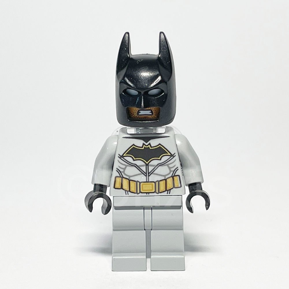 Die Gestaltung der Minifigur ist beeindruckend und detailreich. Der hellgraue Torso ist mit dem charakteristischen Batman-Logo versehen und zeigt eine muskulöse Bedruckung, die durch eine goldene Umrandung und einen goldenen Werkzeuggürtel ergänzt wird. Die hellgrauen Arme und schwarzen Hände fügen sich nahtlos in das Gesamtbild ein. Der Kopf der Figur ist schwarz mit einem doppelseitigen Gesichtsausdruck; eine Seite zeigt einen neutralen Ausdruck mit Bartschatten, die andere zusammengebissene Zähne. Die markante schwarze Batman-Maske mit offener Kinnpartie rundet das Erscheinungsbild ab.