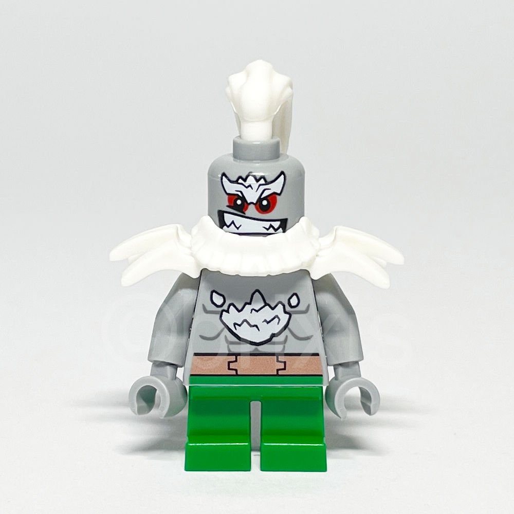 Die Gestaltung der Doomsday-Minifigur ist durch ihre markanten Details unverwechselbar. Der hellgraue Torso zeigt ein Muster eines muskulösen Oberkörpers mit weißen Spritzern und einem Gürtel, was der Figur eine bedrohliche Präsenz verleiht. Der Kopf ist mit buschigen weißen Augenbrauen, roten Augen und gefletschten Zähnen versehen, die den furchterregenden Ausdruck unterstreichen. Die kurzen grünen Beine sind schlicht gehalten, während die weißen Schulterpanzer mit auffälligen Spikes das martialische Erscheinungsbild betonen. Abgerundet wird das Gesamtbild durch eine weiße Feder als Pferdeschwanz und einen auffällig geflammten Bart.