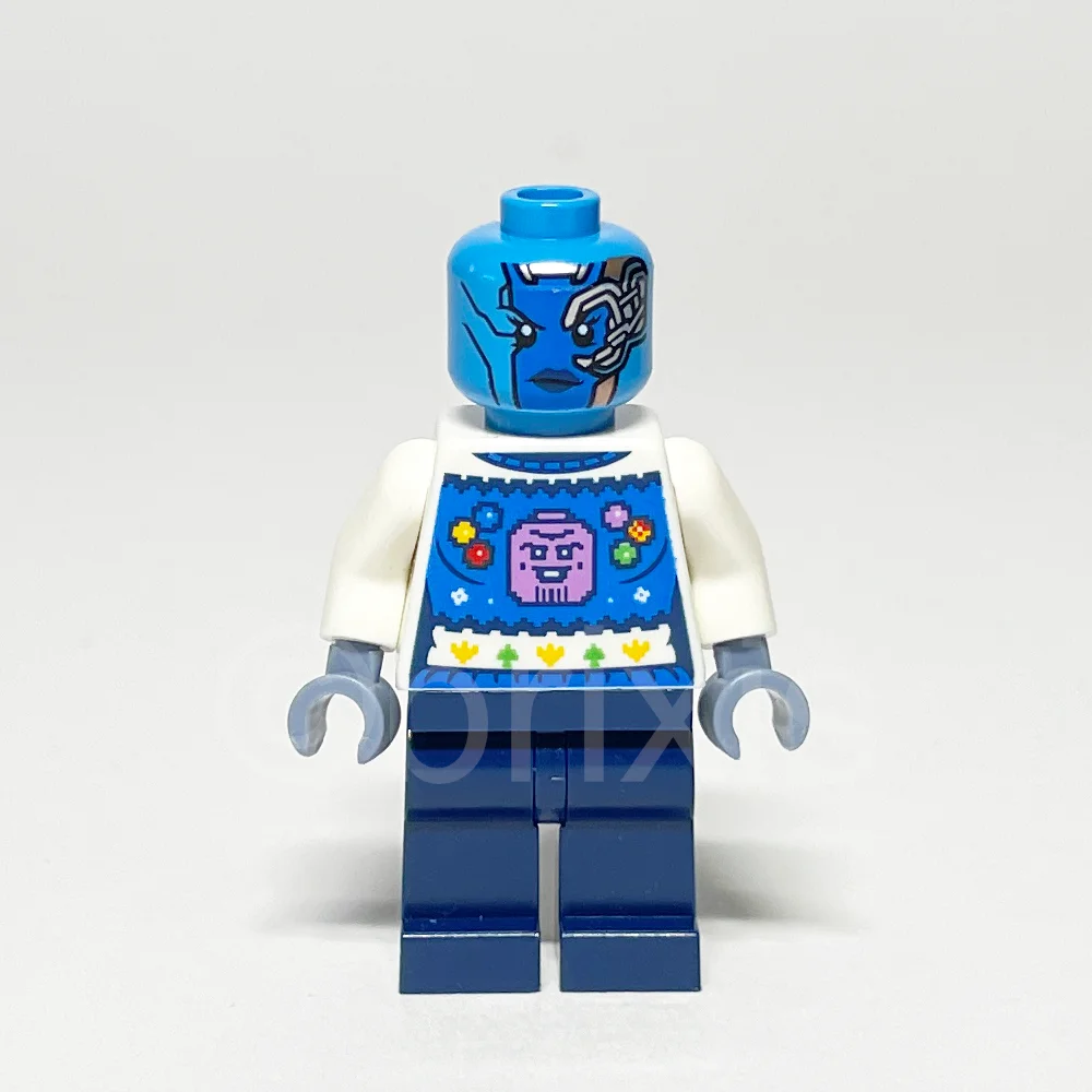 Die Gestaltung der Minifigur ist besonders bemerkenswert. Der weiße Torso ist mit einem festlichen Pullover verziert, der ein blaues Panel, einen Kragen und ein Taillenband zeigt. Auf der Rückseite findet sich ein Herzmotiv mit den Köpfen von Gamora und Nebula, ergänzt durch Infinity-Steine. Der Kopf in dunklem Azurblau besticht durch ein mechanisches linkes Auge, kupferfarbene Platten und silberne Streifen, die das charakteristische Aussehen von Nebula perfekt einfangen. Dunkelblaue Hüften und Beine ohne Aufdruck runden das Erscheinungsbild ab.