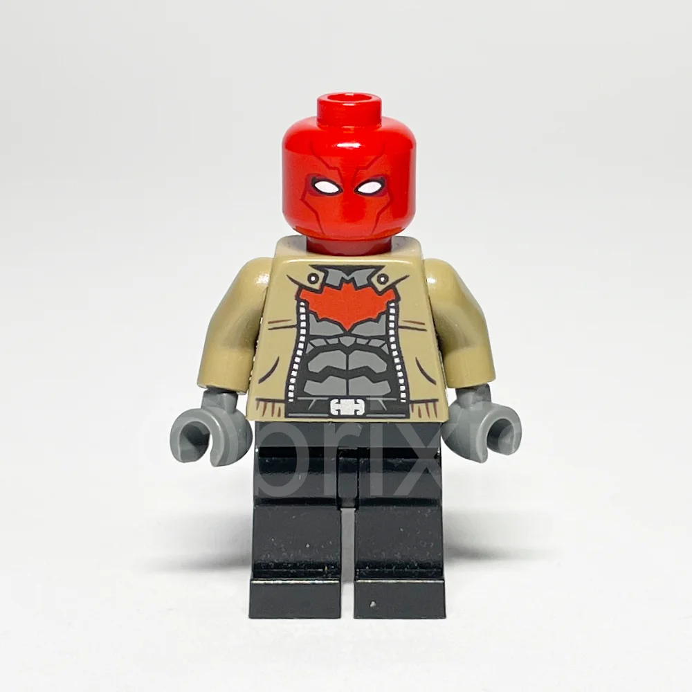 Die Gestaltung der Minifigur ist besonders markant. Der dunkelbeige Torso zeigt eine Batman-Jacke, die über einer dunkelgrauen Rüstung getragen wird, und wird durch ein auffälliges rotes Fledermaus-Logo akzentuiert. Die dunkelbeigen Arme und dunkelblaugrauen Hände ergänzen das robuste Erscheinungsbild. Der rote Kopf mit Maske, versehen mit dunkelroten Konturlinien und weißen Augenlöchern, verleiht Red Hood seine charakteristische, geheimnisvolle Ausstrahlung. Die schlichten schwarzen Hüften und Beine runden das Design ab und unterstreichen die bedrohliche Präsenz der Figur.
