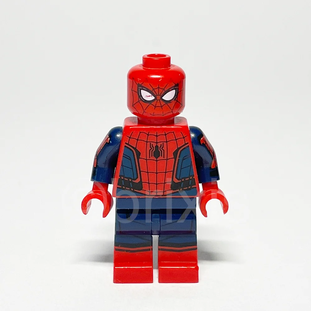 - Torso: Roter Torso mit Spider-Man-Kostüm, dunkelblauem Hintergrund und kleinem Spinnenmuster mit breitem Abdomen, ergänzt durch dunkelblaue Arme mit schwarzem und rotem Netz- sowie Chevron-Muster und roten Händen.
