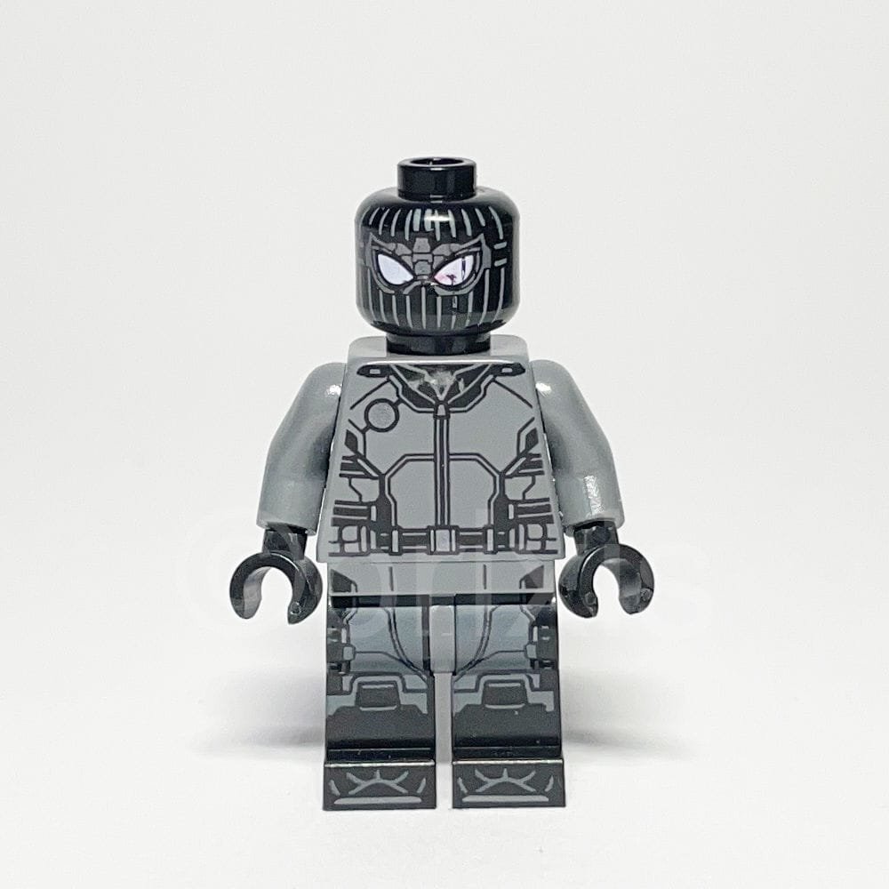 Die Minifigur zeichnet sich durch ihren dunkel bläulich-grauen Torso aus, der mit einer auffälligen Rüstung und schwarzen Linien verziert ist. Ein silberner Kreis und Highlights setzen zusätzliche Akzente. Die Arme sind passend in dunkel bläulich-grau gehalten und enden in schwarzen Händen. Die Beine sind schwarz und mit einem Muster aus dunkel bläulich-grauen Rüstungspanels versehen, was der Figur ein dynamisches Aussehen verleiht. Der schwarze Kopf mit einem Alien-Gesicht, ergänzt durch dunkle bläulich-graue Linien und eine dunkelsilberne Schutzbrille, wird durch große weiße Augen komplettiert und verleiht Spider-Man ein unverwechselbares Erscheinungsbild.