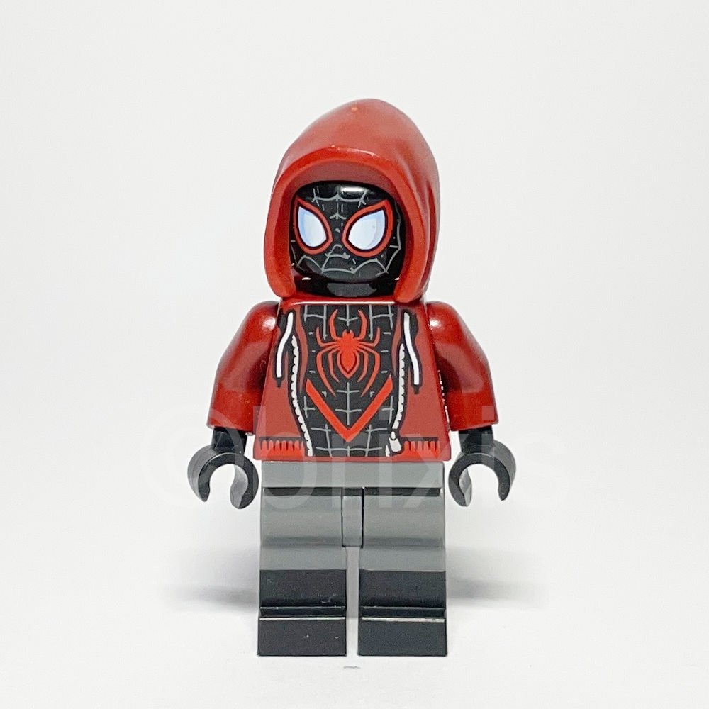 - Torso: Dunkelroter Torso mit Jacke und Spider-Man-Kostüm, verziert mit einem roten Spinnenmuster (Miles Morales), ergänzt durch dunkelrote Arme und schwarze Hände.