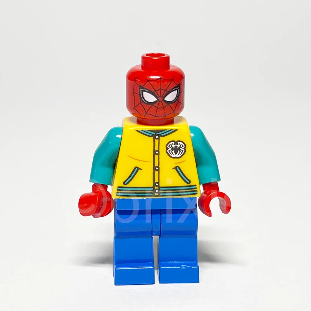Die LEGO Super Heroes Minifigur Spider-Man (SH0757) erschien 2021 und ist mehreren LEGO Super Heroes Sets zugeordnet. Die Figur trägt eine leuchtend hellorange Collegejacke mit dunkel-türkisen Abschlüssen und einem Spinnenlogo, blaue Hüften und Beine sowie einen roten Kopf mit Spinnennetzmuster und großen weißen Augen.