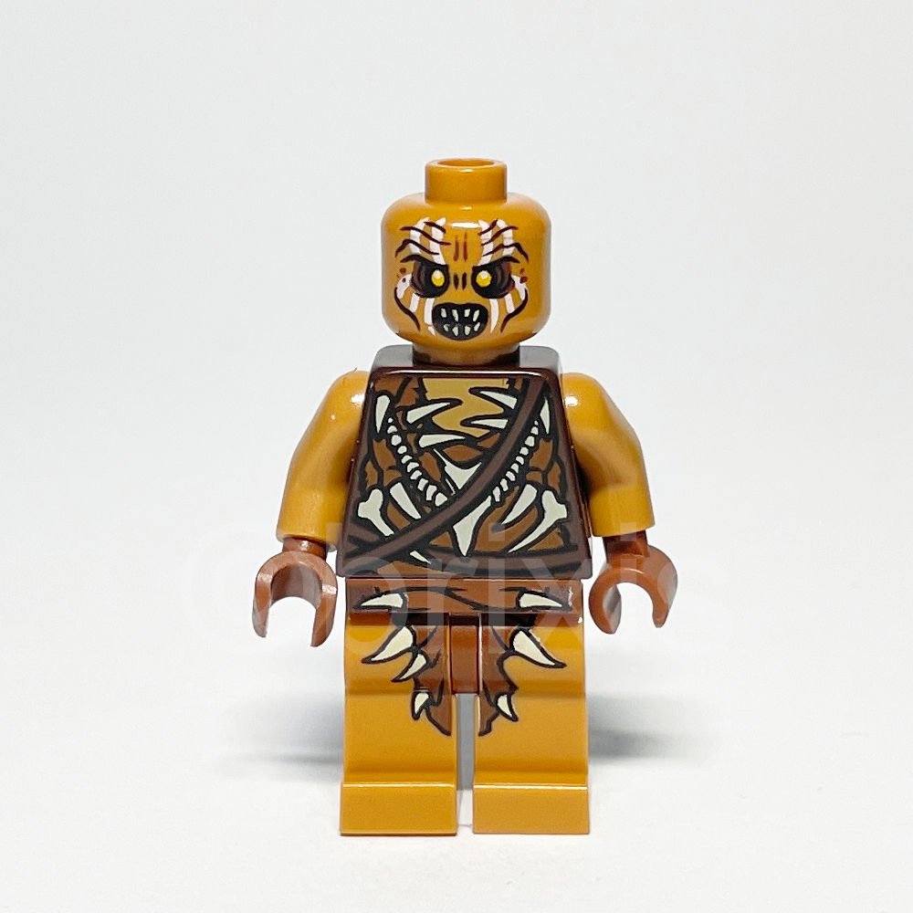 - Torso: Dunkelbrauner Torso mit grober Rüstung, Knochen- und Stachelmuster sowie dunkelbraunen Riemen, passend für die Figur eines Gundabad-Orks, ergänzt durch mittel-nougatfarbene Arme und rötlich-braune Hände.