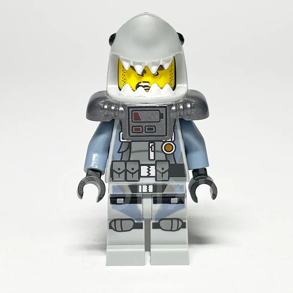 Die Minifigur besticht durch ihren hellgrauen Torso, der einen Taucheranzug mit einem praktischen Nutzgürtel zeigt. Auffällig sind die sandblauen Arme und die schwarzen Hände, die den Look abrunden. Besonders markant sind die dunkelgrauen Lufttanks mit einem schimmernden Perlenglanz, die auf dem Rücken der Figur angebracht sind. Der gelbe Kopf zeigt buschige, rötlich-braune Augenbrauen und einen wütenden Gesichtsausdruck, der durch Bartstoppeln und Falten betont wird. Die hellgraue Kopfbedeckung in Form eines Haikopfes mit offenen Maul und weißen Zähnen verleiht der Figur ein bedrohliches Aussehen.