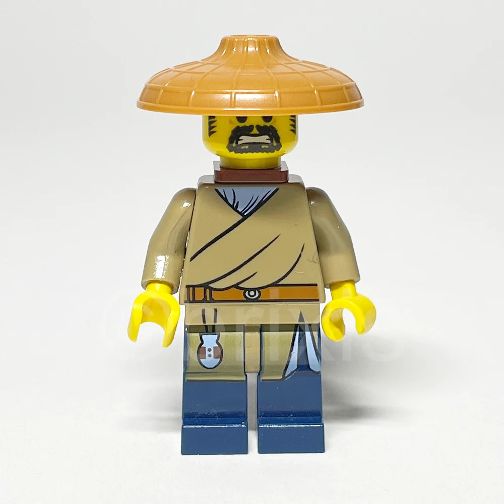 Die Gestaltung der Minifigur Shen-Li ist detailreich und ansprechend. Der dunkelbeige Torso zeigt eine Robe mit einem dunkelorangenen Gürtel über einem hellblauen Hemd, was die traditionelle Kleidung der NINJAGO Welt widerspiegelt. Die dunkelblauen Beine sind mit dunkelbeigen Robenschößen und einer hellblauen Tasche bedruckt, die das Gesamtbild harmonisch abrunden. Besonders markant ist der konische Hut in mittlerem Nougatton, der an traditionelle asiatische Kopfbedeckungen erinnert. Der gelbe Kopf mit schwarzen Augenbrauen, Koteletten und einem Spitzbart verleiht Shen-Li einen erschrockenen Gesichtsausdruck, der die Dynamik der NINJAGO Abenteuer unterstreicht.