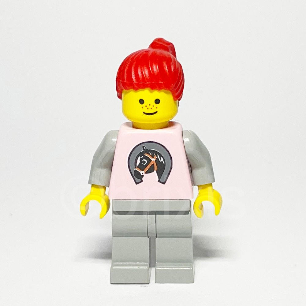 Die Minifigur zeichnet sich durch ihren rosafarbenen Torso aus, der mit einem Paradisa-Pferdekopf in einem Hufeisenmuster verziert ist. Dies verleiht ihr einen einzigartigen Look, der durch hellgraue Arme und gelbe Hände ergänzt wird. Der gelbe Kopf zeigt ein Standard-Lächeln mit roten Nasenfrecken, das einen freundlichen Ausdruck vermittelt. Die hellgrauen Hüften und Beine sind schlicht gehalten und harmonieren perfekt mit den roten Haaren, die in einem eleganten Pferdeschwanz gebunden sind.