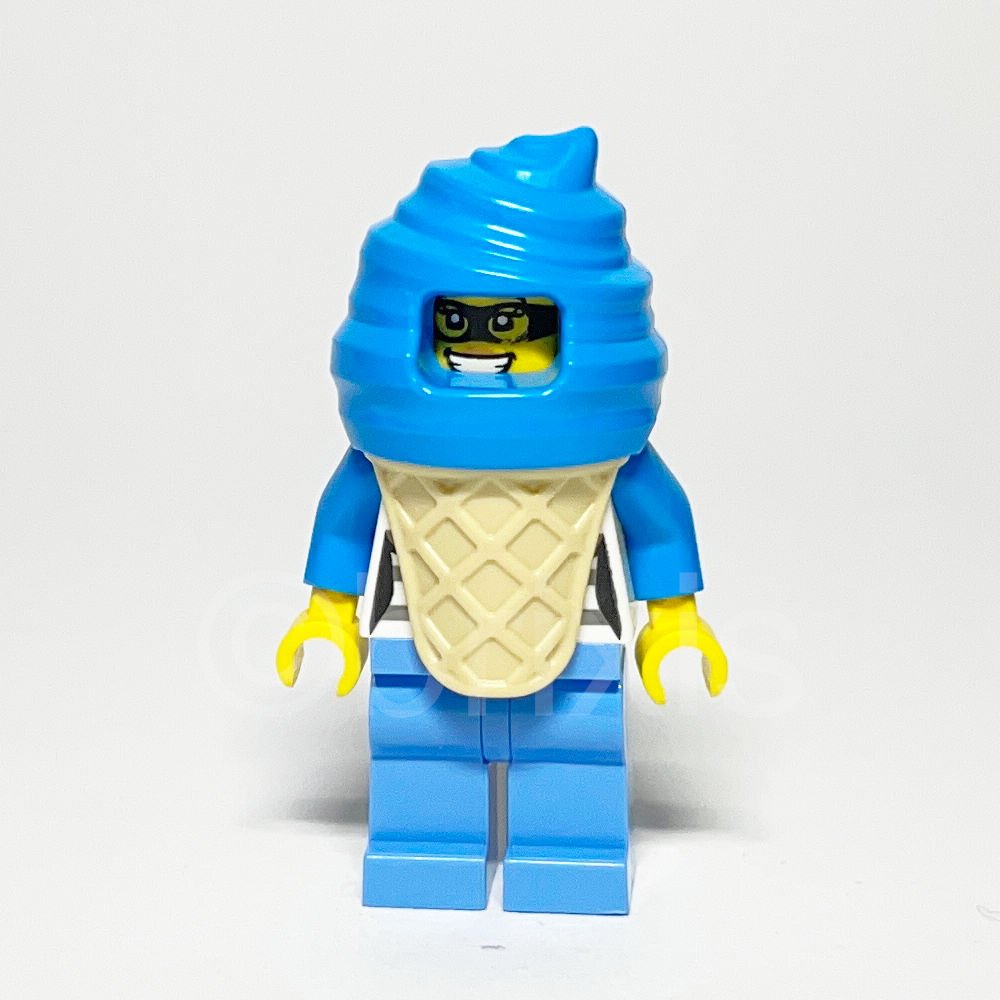 Die Minifigur zeichnet sich durch ihren einzigartigen Look aus. Der weiße Torso ist mit einer Jacke gestaltet, die dunkelblaugraue Gefängnisstreifen über einem dunkelazurblauen Hemd zeigt, ergänzt durch eine auffällige dunkelrosa Fliege. Die dunkelazurblaue Kopfbedeckung in Form einer Eishaube mit einem geformten beigen Eiswaffelmuster verleiht der Figur einen besonderen Charme. Der gelbe Kopf bietet zwei Gesichtsausdrücke: ein offenes Lächeln mit sichtbaren Zähnen und einen missmutigen Ausdruck, beide mit weiblichen schwarzen Augenbrauen und Masken sowie mittelnougatfarbenen Lippen.
